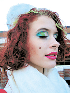 Dressed in an outfit reminiscent of a Jackie-O snow queen, Thomas, a senior double-majoring in dance and theater, pairs her self-made faux fur pillbox hat and matching faux fur removable collar with a Chanel-inspired suit jacket.
