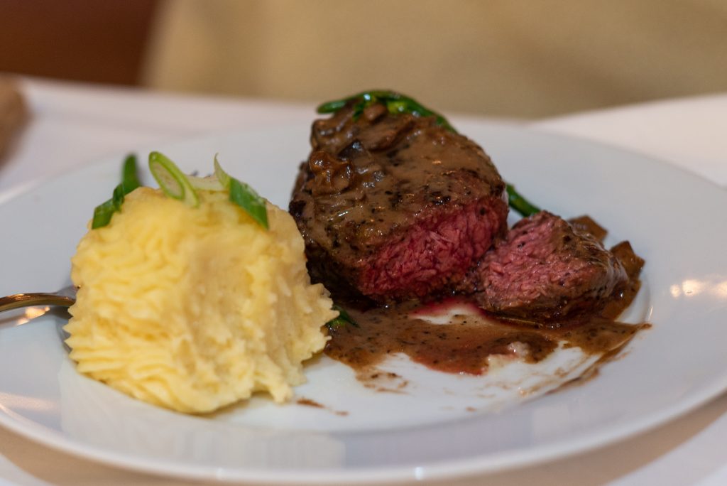 Atlantic salmon.Harry ordered the prime sirloin with a mushroom burgundy sauce, cooked medium-rare. The dish came with whipped potatoes and the vegetable du jour on the side. Harry noted the tenderness of the meat as well as the distinct pepper flavor of the steak, adding that the potatoes were very mild.