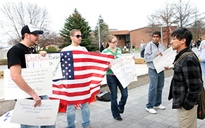 As the College Republicans held signs, they spoke with Binghamton University students who walked by in between classes. Students had mixed views on the rally’s message.