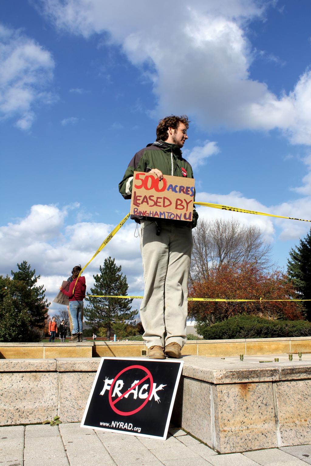 Members of Binghamton Environmental, a campus group coalition that raises awareness of environmental issues involving both the campus and community, protested on central campus against the University’s lease of land for fracking in October 2010.