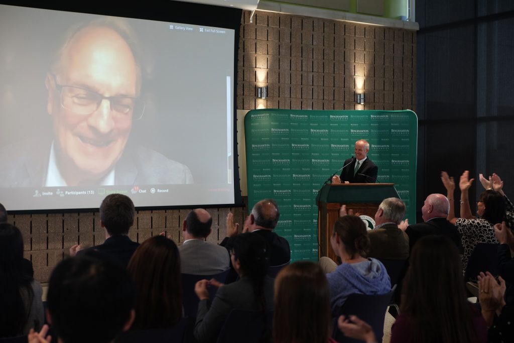 Since Whittingham was in Germany during the press conference, Binghamton University President Harvey Stenger, Donald Nieman, executive vice president for academic affairs and provost at BU and around 100 attendees communicated with him via a livestream chat at the Innovative Technologies Complex. Stenger opened the event with an appreciative speech dotted with humor.