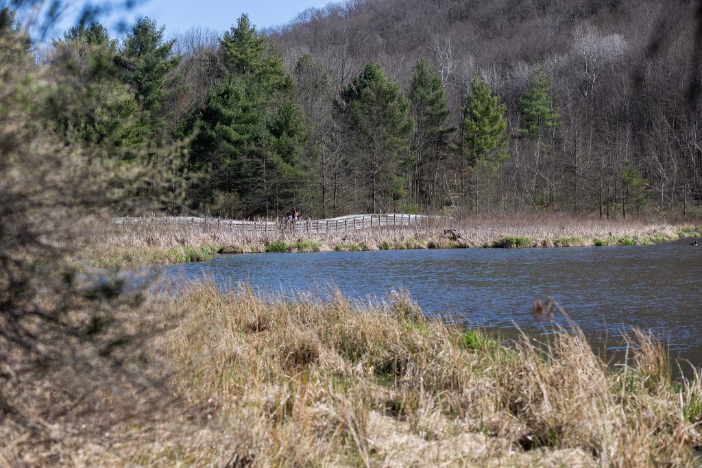 Designated in 1969, Binghamton University’s Nature Preserve currently contains 190 acres of natural habitat for exploration. The preserve — which includes a 20-acre wetland — provides an opportunity to experience the wonders of nature and wildlife and is home to over 200 bird species, a diverse amphibian and reptilian population, as well as a wide variety of mammals. Each spring, the preserve hosts the annual migration of yellow-spotted salamanders from wooded forests around the College-in-the-Woods living community to the preserve ponds. There are several maintained hiking trails and a wooden footbridge for hikers to encounter the many animal species, including mammals like deer, beaver, fox, mink, coyotes, muskrats and porcupines along the trails.
