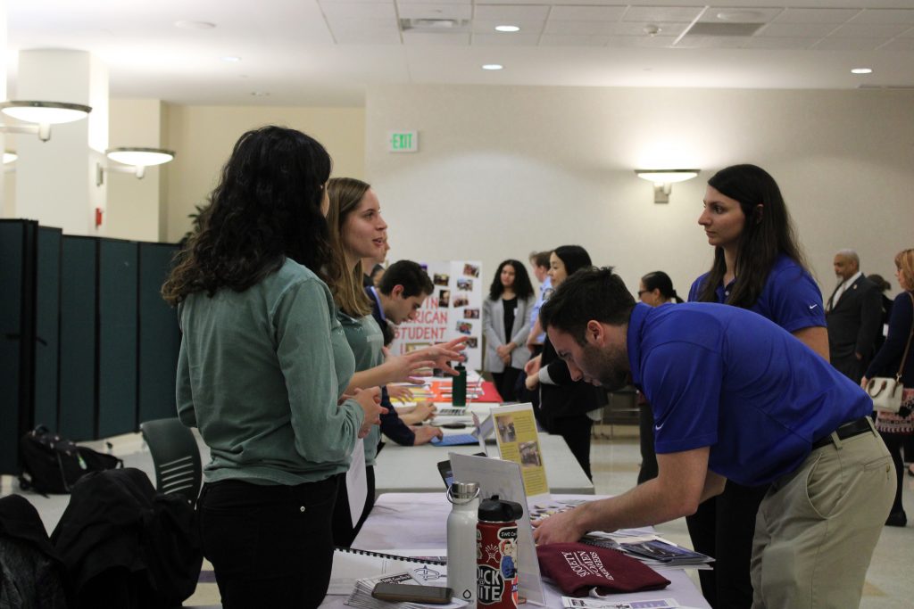 Typically, at job and internship fairs, visiting recruiters from companies nationwide sit behind tables and wait for students to approach with their elevator pitch. But at Tuesday’s event, student groups were the ones at the tables and the employers came to them. Erin Wise, assistant director of mentorship and diversity initiatives at the Center, said the event demonstrates a different method of networking.