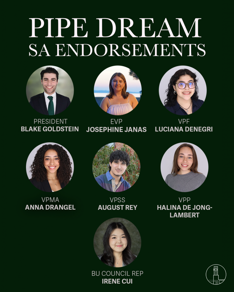 Although running unopposed, Pipe Dream confidently endorses Halina de Jong-Lambert for vice president for programming. Serving multiple positions across the SA since her sophomore year, de Jong-Lambert, a junior majoring in economics, is more than qualified to take on the role as VPP.