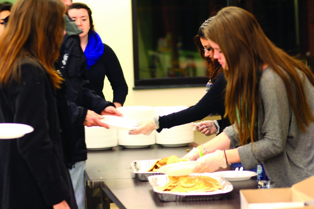 Nia Pellone/Assistant Photo Editor Members of Habitat for Humanity serve pancakes to Binghamton University students at “Cloudy with a Chance of Pancakes.” Habitat for Humanity and Tau Alpha Upsilon hosted the event on Wednesday to benefit Hurricane Sandy relief efforts.