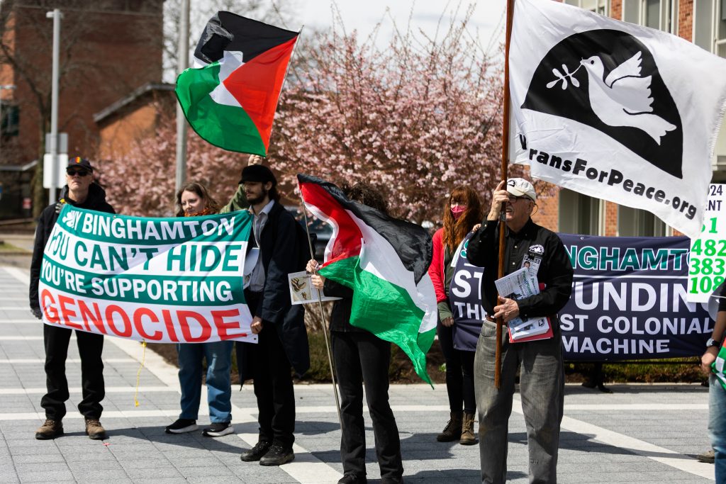 Organized by the activist group Binghamton Solidarity for Palestine, the demonstration was held on Tax Day, the last day for Americans to file federal income tax returns. A representative from the organization said the protest date was selected to highlight how defense companies and weapons manufacturers are “receiving billions of taxpayer dollars in weapons contracts each year.”