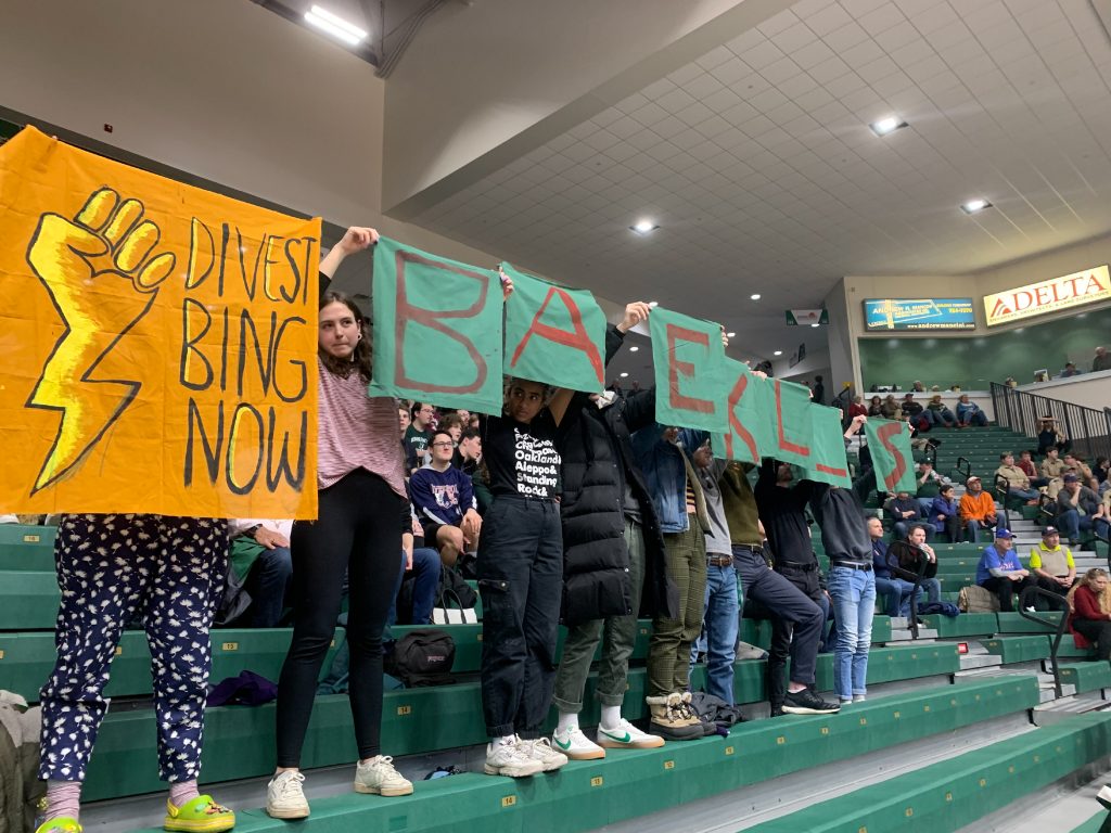 On Wednesday, Feb. 12, several members of DIVEST BING attended the Bearcats’ basketball game to express our discontent with the BAE Systems-sponsored halftime show. Several students in the stands held a banner, while others distributed information in the concessions area.