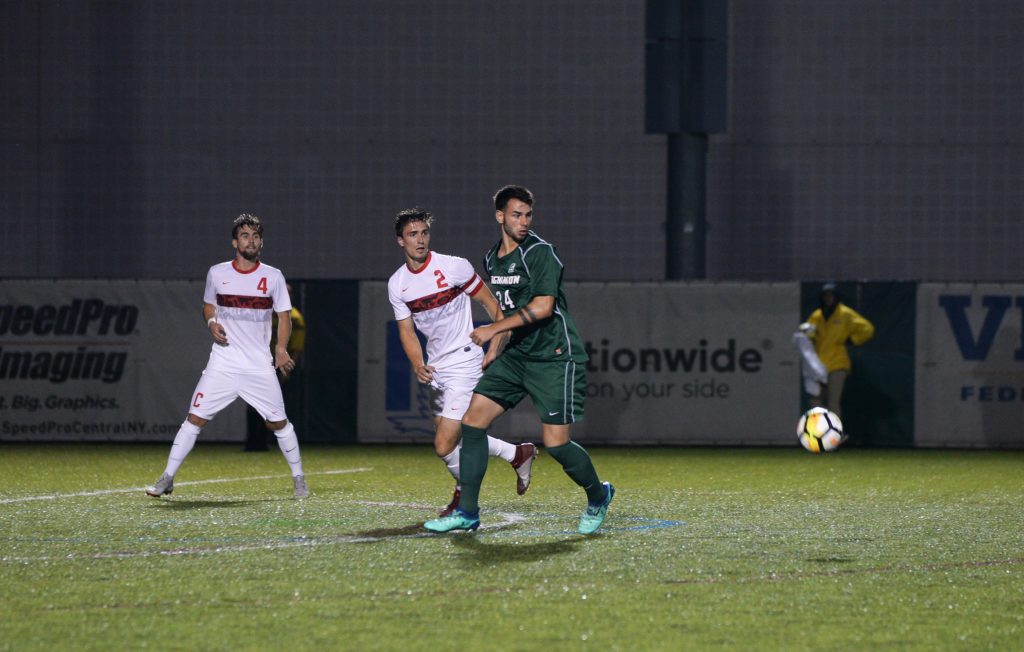 After going into double overtime and outshooting No. 18 Colgate, 16-7, the Binghamton men’s soccer team came away with a tie against the Raiders (4-4-1). The Bearcats (1-4-2) were able to maintain possession for the majority of the first half, outshooting Colgate, 10-2, but could only manage three shots on goal. Binghamton recorded three shots within the first 10 minutes of the game while the Raiders did not get in a shot until the 25th minute.
